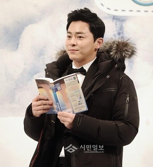 조정석은 블랙컬러의 패딩을 입고 두 손으로 책을 잡고 카메라를 응시하고 있다.