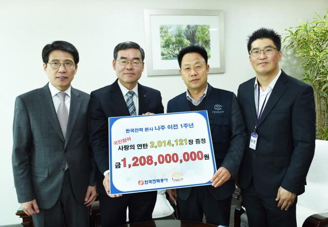 한전은 광주전남 공동혁신도시(빛가람)로의 본사 이전 1주년을 기념해 이전일인 2014년 12월 1일을 상징하는 연탄 201만4121장 적립을 목표로 지난 11월25일부터 '사랑의 연탄 나눔' 온라인 캠페인을 전개해왔다.