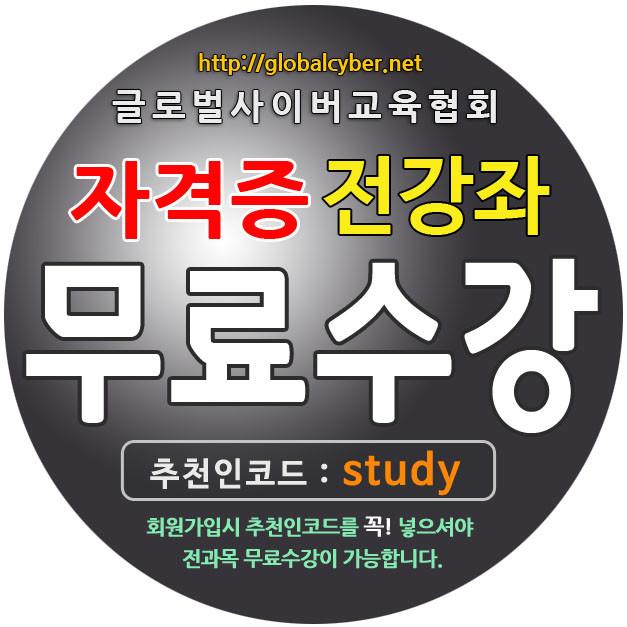자격증 사이트 글로벌사이버교육협회(www.globalcyber.net) 에 회원 가입 시 추천인(쿠폰코드)에 ‘study’를 입력하면 총 22개의 민간자격증과정에 대한 무료수강이 가능하다.