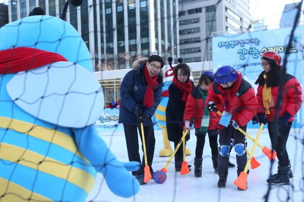 | ▲ 13일 이광구 우리은행장(사진 왼쪽 첫번째)이 엄규숙 서울시 여성가족정책실장(사진 왼쪽 두번째)과 함께 서울광장 스케이트장에서 자매결연 지역아동센터 어린이들과 함께 겨울 스포츠인 브룸볼 게임을 하고 있다. | ||