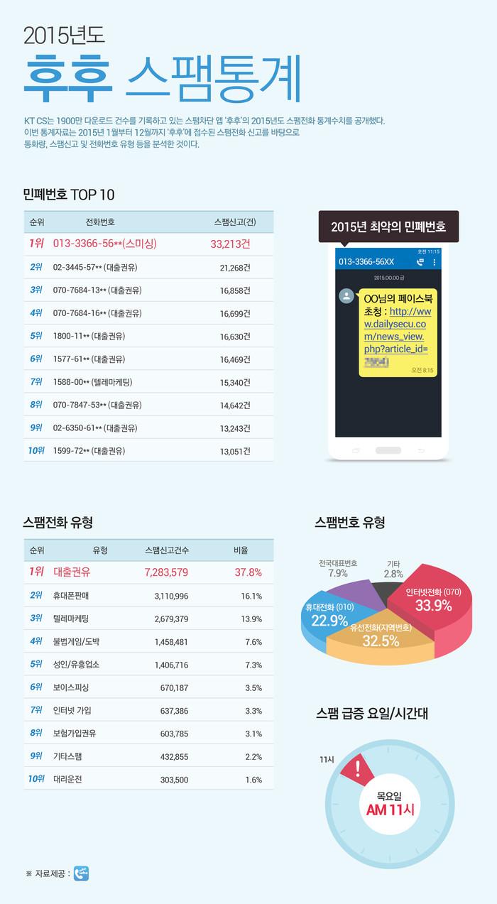 [시민일보=김다인 기자]KT CS(대표: 유태열, www.ktcs.co.kr)가 스팸차단앱 후후의 2015년도 스팸신고 통계수치를 공개했다.