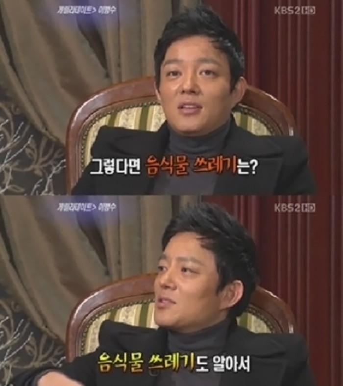 당시 이범수는 "분리수거는 기본이다"이라며 "난 음식물 쓰레기도 알아서 버린다"고 설명했다.