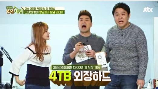 이날 서유리는 4TB외장하드를 보유하고 있다고 말해 전현무와 김구라를 놀래켰다.4TB는 3GB영화파일 1300여 개를 저장할 수 있는 외장하드 규모다.