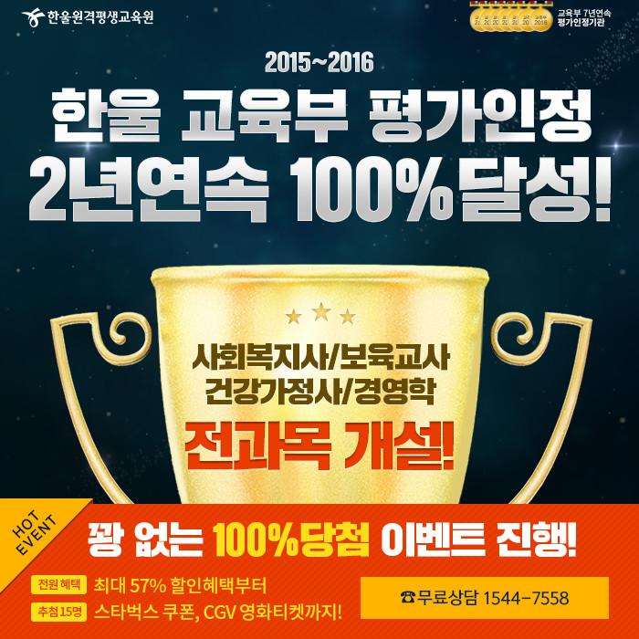 한울은 2년 연속 교육부 산하 국가평생교육진흥원 평가인정 100% 달성·사회복지사·보육교사·건강가정사 자격증 과정과 학위취득(경영학)과정 전 과목 개설의 기쁨을 학습자와 함께 나누고자 100% 당첨 감사 이벤트를 진행한다.