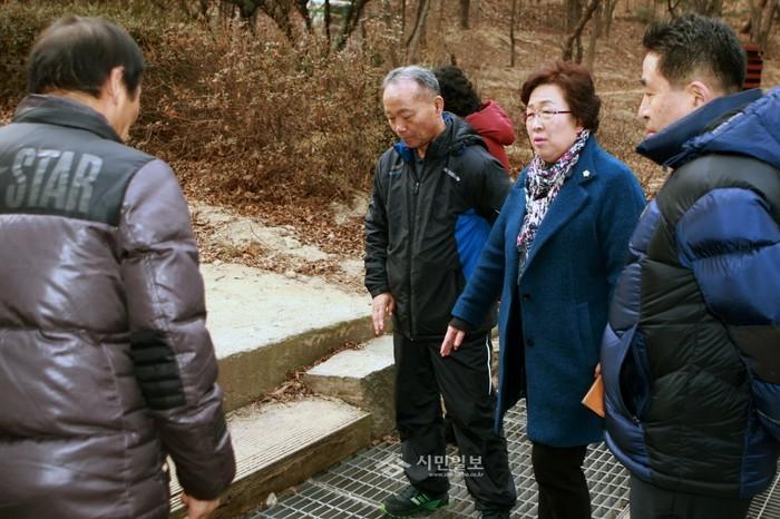 | ▲ 김명숙 의원(오른쪽 두 번째)이 주민으로부터 오동근린공원 진입로 정비 관련 민원을 관계자들과 함께 청취하고 있다. | ||