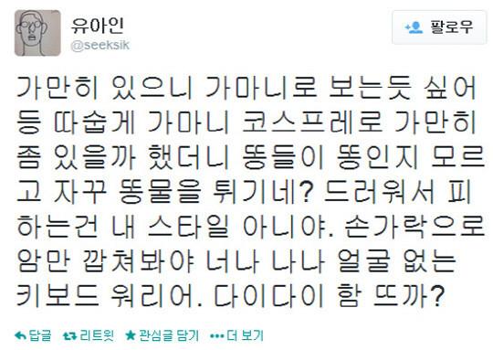 유아인은 과거 자신의 트위터를 통해 "가만히 있으니 가마니로 보는 듯 싶어 등 따뜻하게 가마니 코스프레로 가만히 좀 있을까 했더니,똥들이 똥인지 모르고 자꾸 똥물을 튀기네"라는 내용의 글을 게재했다.
