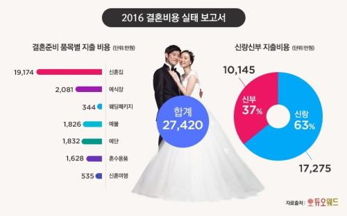 전체 결혼 비용은 수도권(2억9,410만원)이 지방(2억5,692만원)보다 3,718만원(14.5%)이나 더 많이 사용했다.