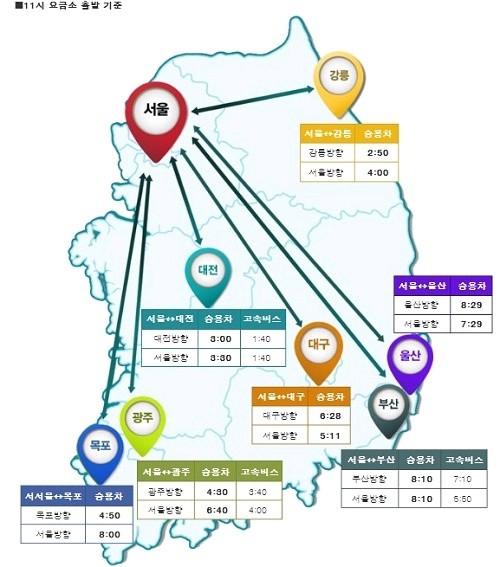 서울에서 광주까지는 하행 4시간 30분, 상행 6시간 40분이, 서울에서 대전까지는 하행 3시간, 상행 3시간 30분이 걸린다.