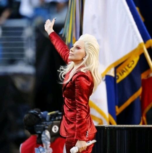 국가 제창은 레이디 가가가 했다. 붉은 슈트를 입고 붉은 아이라이너를 칠한 레이디 가가는 폭발적인 가창력으로 미국 국가를 열창했다. 레이디 가가의 열창이 끝날 무렵 다섯 대의 전투기가 슈퍼볼 경기장 상공을 날아 분위기를 더욱 뜨겁게 달궜다.