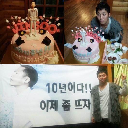 진구는 지난 2013년에 데뷔 10주년을 맞이해 팬들에게 케이크와 현수막을 받은 사진을 게재했다.