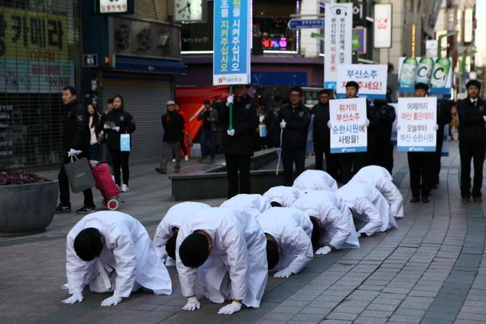 지난 21일 부산 남포동 거리에 나선 대조주선 직원들은 '부산소주 지켜주세요!' 등의 팻말을 들고 삼보일배 퍼레이드를 펼치며 시민들에게 '지켜달라'고 호소했다.