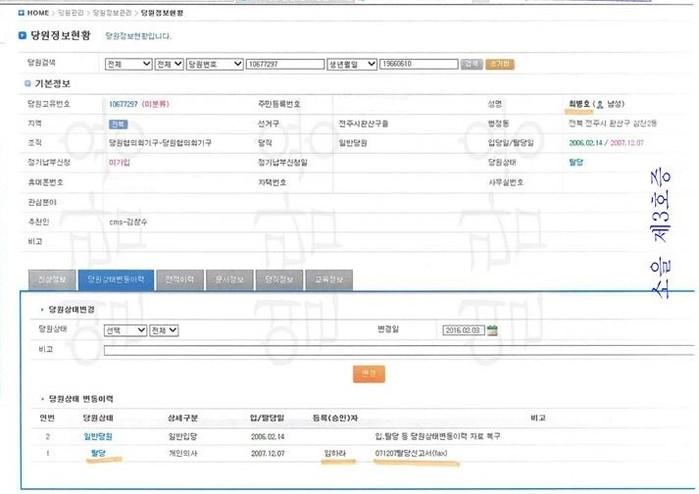 그러다 최근 확보한 당원정보현황 자료에 의해 탈당과 관련한 자신의 주소지 기재 내역과 시기 등이 비상식적으로 일치하지 않은 점을 알게 됐다. 당초 탈당의 근거로 제시됐던 해당 FAX에는 당사자 서명은 물론 날인도 없었다.
