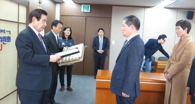 | ▲ 한광옥 국민대통합위원회 위원장(왼쪽)이 김명기 한전 민원대책처장에게 표창을 수여하는 모습. | ||