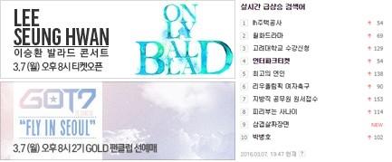 오늘(7일) 7시 40분경 인터파크 티켓과 서버시간이 함께 검색어에 올랐다. 이는 8시 예정된 GOT7(갓세븐)의 콘서트와 이승환의 콘서트 때문. 두 가수의 인기가 입증되는 순간이었다.