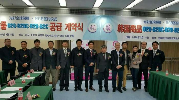 RGB그룹은 14일 중국 충칭(중경) 양강특구 국제무역센터에서 중국 정부 와 은행, 기업 관계자와 충칭 TV 등 중국 유력 언론들이 대거 참석한 가운데 광채국제전자상무유한공사, 중국cybernaut인베스트먼트그룹과 충칭 국제보세 한국관 운영 및 B2B, O2O 비지니스 공동 운영과 투자에 대한 계약을 체결했다.