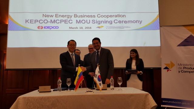 MOU 체결은 김시호 한전 부사장과 산티아고 레온 아밧 에콰도르 MCPEC 차관간에 서명이 이뤄졌으며 ▲EVC 구축사업 등 에너지 신산업 프로젝트 우선 협상 ▲에너지 신사업 분야 기술교류 (전기차, 스마트그리드, ESS, 지능형검침인프라 등) ▲전력산업 분야 기술협력 및 정보 교류 등에 상호 협력하기로 했다.