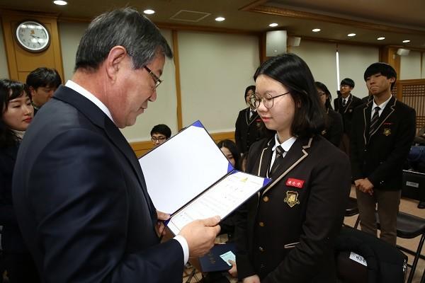 이번 장학증서 수여식에서는 우수대학 입학 장학금 9명, 명문고 육성 장학금 53명 등 총 62명에게 1억 7,000여만 원의 장학금이 전달됐다.