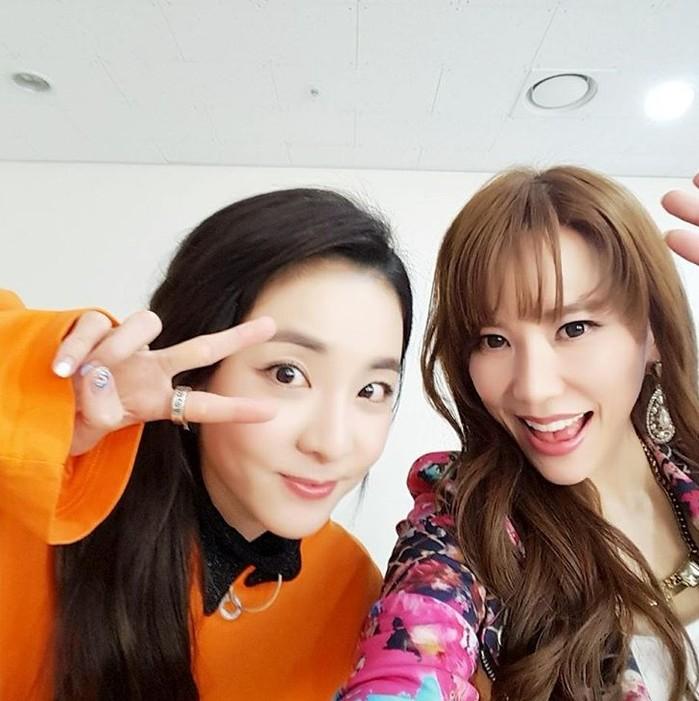 공개된 사진 속에는 주다인과 '슈가맨'의 고정 출연자인 걸그룹 투애니원의 산다라박이 대기실에서 함께 포즈를 취하고 있었다.