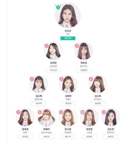 1등은 예상대로 전소미가 380,783의 득표수를 기록하며 톱1이 됐다. 이 수치는 2등 김세정, 3등 최유정의 득표수를 합친 것보다 많아 놀라움을 주고 있다.