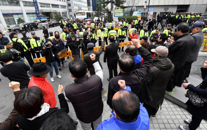 | ▲ 새누리당 공천갈등이 최고조에 달한 25일 오후 여의도 새누리당 당사 앞에서 새누리당 김무성 대표를 지지하는 집회(앞)와 비난하는 집회(뒤)가 동시에 열리고 있다. | ||