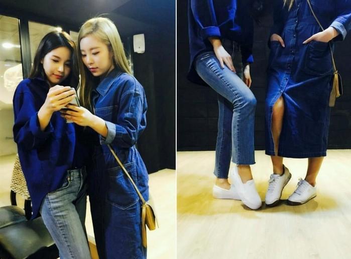 해당 사진에서 솔라는 청셔츠와 청바지를, 휘인은 청원피스를 착용한 채 다리 한쪽을 들어올린 포즈를 취했다.