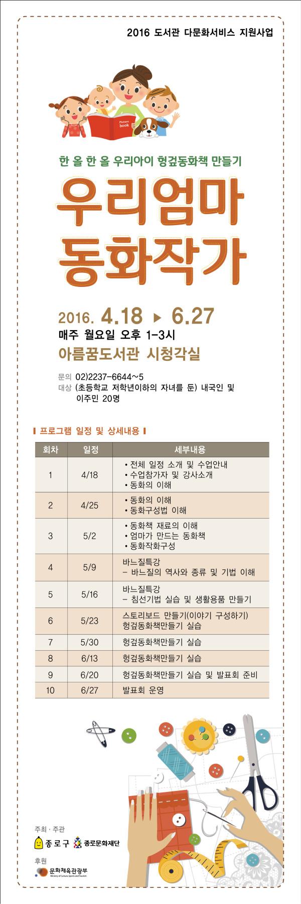 이번 프로그램은 이러한 지역적 특성을 반영해 ‘바느질’을 매개로 다문화, 한(韓)문화 주민이 상호 교류할 수 있는 기회를 제공하기 위한 것으로, 한 올 한 올 우리아이 헝겊동화책 만들기‘우리엄마 동화작가’라는 주제로 ▲엄마가 만드는 동화책 실습 및 발표회 ▲바느질 특강 ▲전통 침선기법 실습 및 생활용품 ▲동화책 재료의 이해 등의 프로그램이 진행된다.