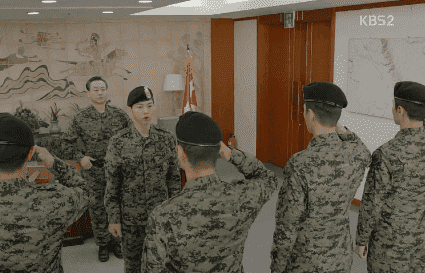 최근 방송에서 송중기(유시진 대위 역)는 부대원들과 함께 상관에게 경례하는 장면이 나온다.