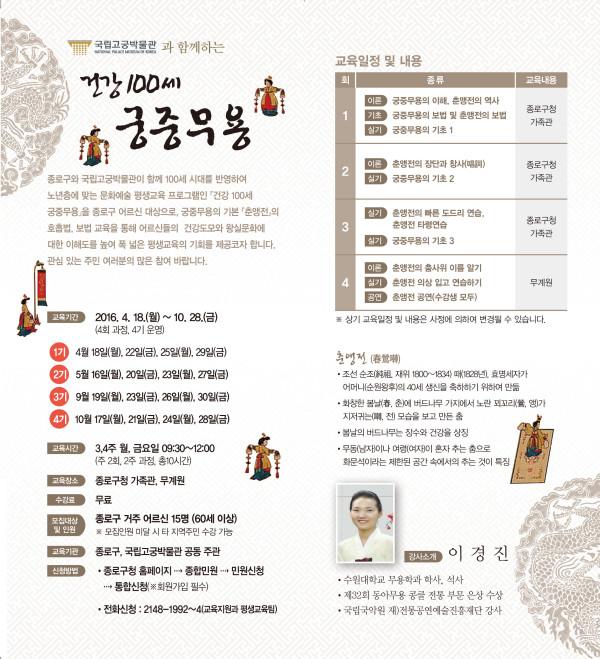 교육 내용은 궁중무용의 기본이며 정수인 ‘춘앵전’의 호흡법, 보법(걷는 방법) 등 ▲1회 춘앵전의 역사 ▲2회 춘앵전의 장단과 창사(唱詞) ▲3회 춘앵전의 빠른 도드리 연습 ▲4회 춘앵전 공연(수강생)으로, 이론과 실기를 병행해 진행 한다.