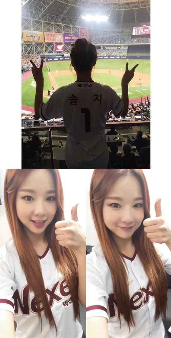 사진 속 솔지는 시구가 끝난 직후 넥센의 유니폼을 과시하는 포즈로 인증샷을 남겼다.
