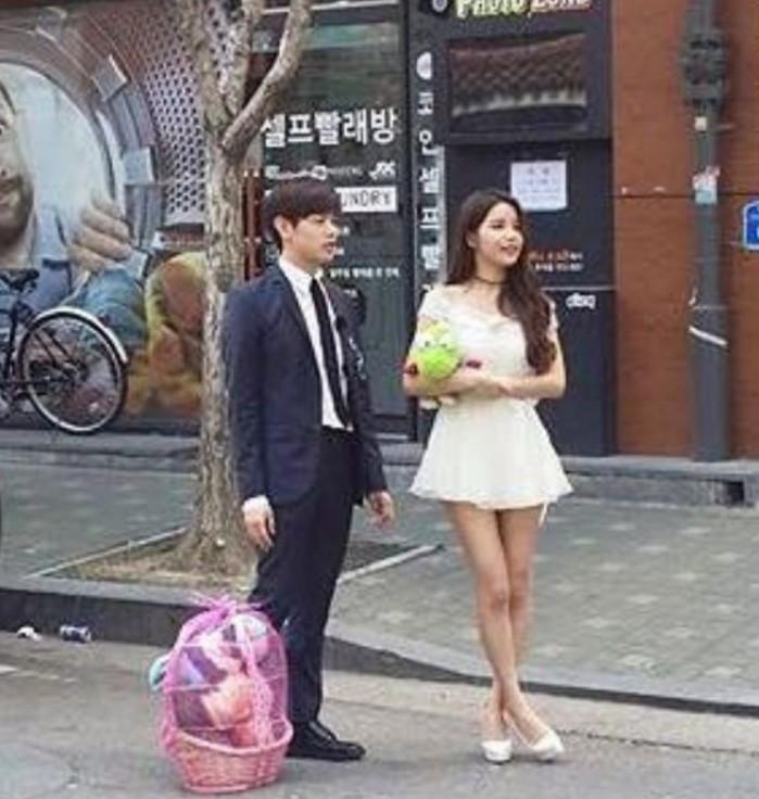 사진 속 솔라와 에릭남은 양가에 인사를 가는 듯 과일바구니를 들고 택시를 기다리고 있다.