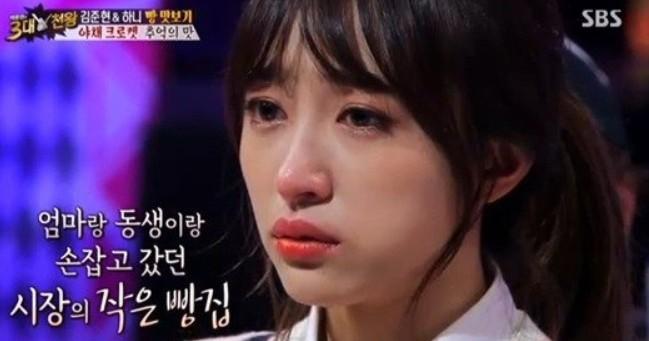 하니는 '백종원의 3대천왕' 빵특집에 출연해 크로켓 빵을 한입 베어물며 "나 알아요 이거...엄마랑 동생이랑 함께 먹던 우리집이 좀 힘 들었을 때 먹던 그 맛이다"라고 말하며 눈시울을 붉혔다.