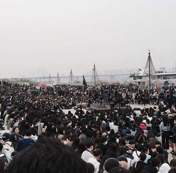 그가 올린 사진은 바로 여의도 버스킹 공연 현장 사진으로 4천명의 관객들이 공간을 채우고 있어 그들의 인기를 실감케 했다.
