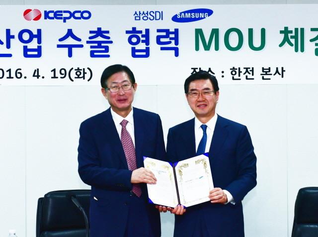 | ▲ MOU 체결식에서 한전 조환익 사장(왼쪽)과 삼성SDI 조남성 사장이 기념촬영을 하고 있다. | ||