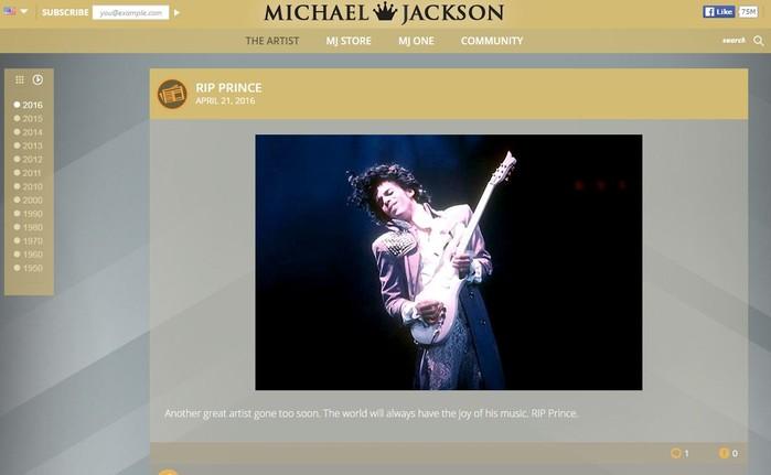 이와 관련해 이날 마이클잭슨닷컴에는 ‘RIP(Rest In Peace) PRINCE’라는 제목이 달린 사진이 올라와 눈길을 끌었다.