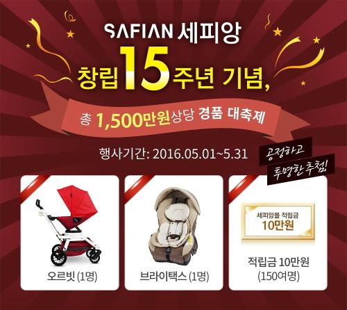 해당 이벤트는 5월 한달간 세피앙몰에서 제품을 구매한 회원들 중 추첨을 통해 오르빗 유모차, 브라이택스 카시트, 적립금 10만원 등을 제공하며 세피앙몰 신규 가입 회원 전원에게는 적립금 5000원을 지급한다.