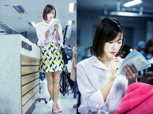 분홍색으로 포인트를 준 의상으로 여리여리한 매력을 강조하며 화려한 패턴의 스커트를 매치해 에디터다운 감각적인 패션은 물론 펜으로 열심히 필기를 하며 대본에 몰두하는 모습은 외모는 물론 자세마저도 섹시함 그 자체다.