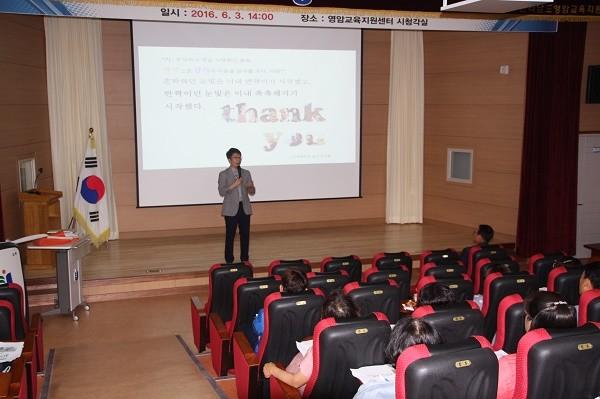 | ▲ 영암군 관내 초, 중등학교 교사를 대상으로 서울대학교 행복연구센터 홍영일 박사의 청소년들의 '행복수업의 이론적 기반 및 추진 성과' 강의 모습 | ||