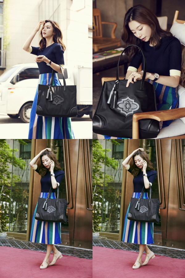 사진 속 박수진은 네이비 니트에 블루 스트라이프 스커트를 입고 오야니의 라지사이즈의 램지 쇼퍼백을 매치해 청순한 매력으로 시선을 사로잡는다.