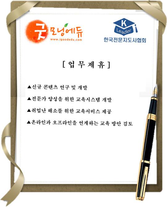 최근굿모닝에듀는 이들 자격증뿐만 아니라 더 많은 교육 서비스를 위해 아동영어지도사, 창의수학지도사, 독서지도사, 창의미술지도사 등 전문자격분야의 신규 콘텐츠를 개발하여 오픈했다.