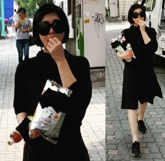 선우선은 게시물 속 사진 속에서 과자를 맛있게 먹으며 여유롭게 걸어가고 있다.