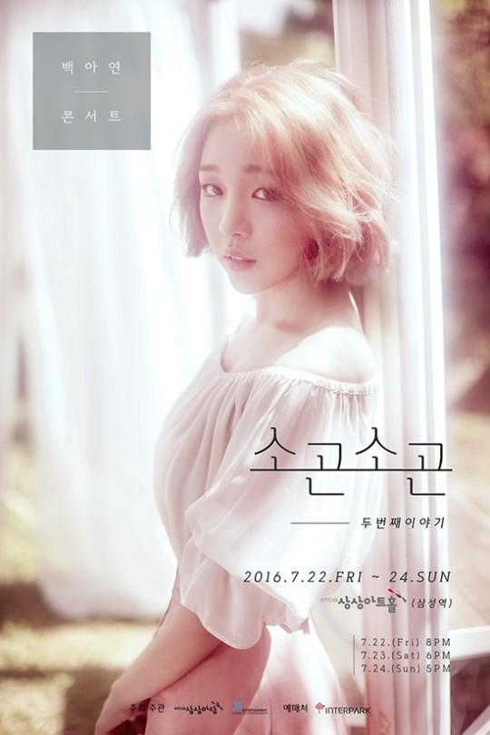 백아연은 오는 22일부터 24일까지 3일 동안 총 3회에 걸쳐 서울 삼성동 KT&G상상아트홀에서 두 번째 단독 콘서트 '소곤소곤 두 번째 이야기'를 개최한다.