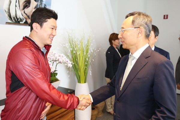 | ▲ 황창규 KT 회장(오른쪽)이 리우 올림픽 사격 종목에 출전하는 진종오 선수를 격려하고 있다. | ||