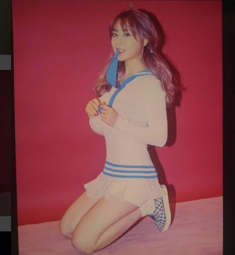 사진 속 허영지는 무릎을 꿇고 카메라를 바라보고 있다. 귀여운 의상이 허영지의 깜찍한 매력을 더해준다.