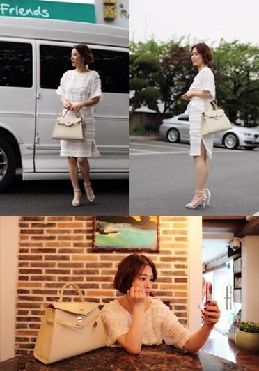 김현주는 화이트 원피스와 스트랩 힐에 니뮤에(NIMUE)의 스테이시 핸드백을 포인트로 더했다.
