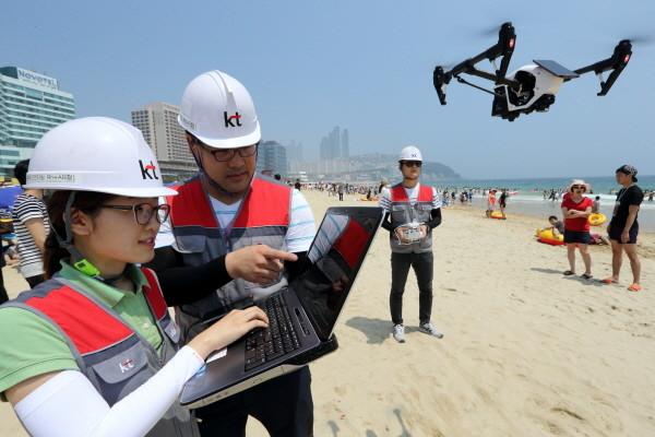 | ▲ ] KT 직원들이 부산 해운대에서 드론을 이용한 네트워크 품질 측정을 하고 있다. | ||