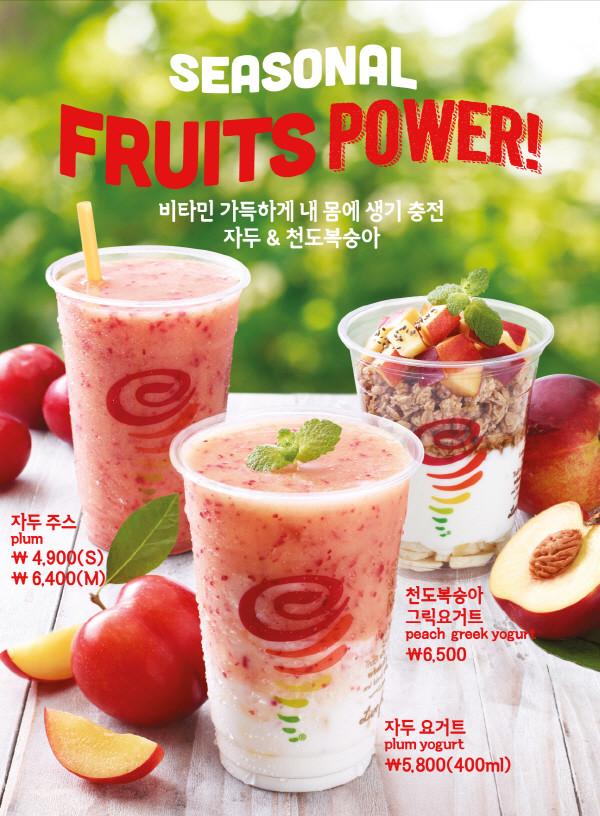 이번 신제품은 여름 제철 과일인 자두와 천도복숭아를 생과일 그대로 매장에서 직접 갈아 과일 본연의 맛과 영양을 담았다.