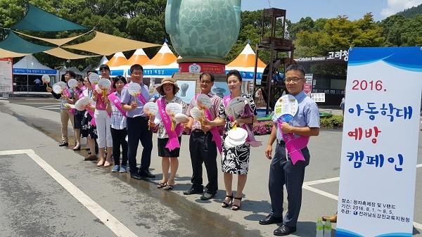 이번 아동학대 예방 캠페인은 강진의 대표축제인 강진청자축제 기간에 축제장을 찾은 학생과 학부모 및 관광객을 대상으로“아동학대 예방 우리 모두의 관심이 중요합니다.”주제로 더운 여름에 시원하게 지역 축제를 즐길 수 있도록 부채와 냄비받침을 나누어 주며 캠페인을 펼쳤다.