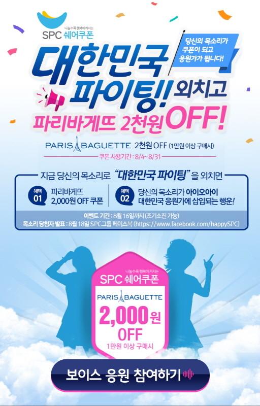 SPC그룹은 쉐어쿠폰 캠페인의 첫 행사로 다가오는 지구촌 스포츠 축제를 맞아 대한민국 선수들을 응원하고 고객들에게 다양한 혜택을 제공하는 ‘대한민국 파이팅’ 이벤트를 실시한다.