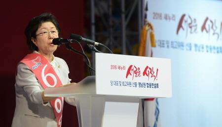 “사심없이 당의 단합, 그리고 박근혜 정부의 성공을 위하여 맏며느리 역할을 다하고 싶다. 그리고 우리 사회에 산적한 갈등요인을 해소하고 대한민국 선진화와 통일한국 기반을 구축하는 것을 20대 국회의 가장 큰 과제로 생각하고 있다.