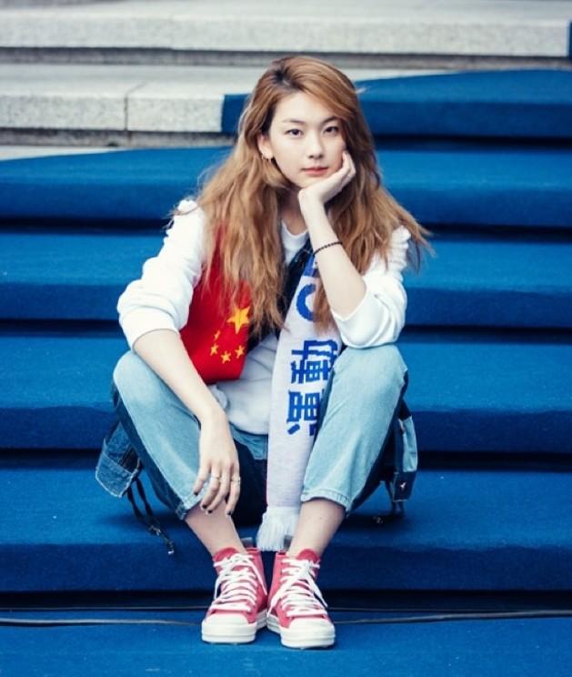 사진 속 김진경은 계단위에 앉아 중국 국기와 한자가 그려진 점퍼와 캐주얼한 팬츠를 입고 카메라를 정면으로 응시하고 있다.